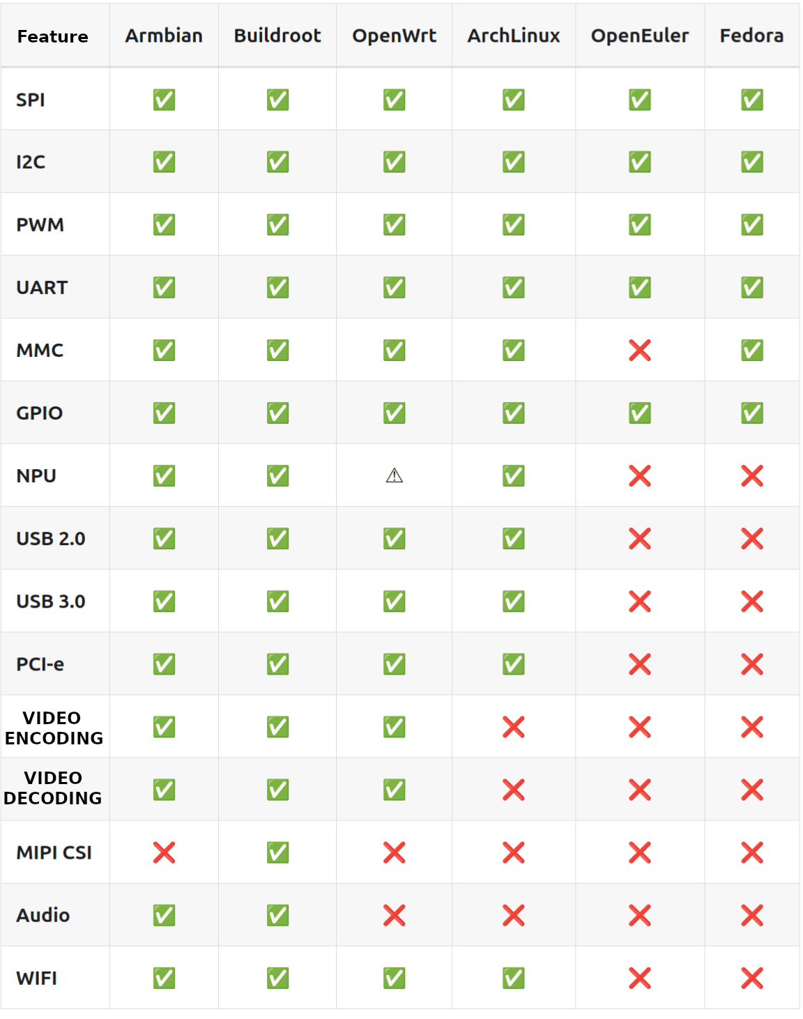 การรองรับไดรเวอร์จะแตกต่างกันไปในแต่ละระบบปฏิบัติการ โดยอิมเมจ Linux ที่สร้างด้วย Buildroot เท่านั้นที่รองรับฟีเจอร์ทั้งหมดของบอร์ด DShanPi-A1 ขณะที่ Armbian และ OpenWrt รองรับได้ใกล้เคียงมาก แต่ยังขาดการรองรับ MIPI CSI และในกรณีของ OpenWrt ยังไม่รองรับระบบเสียงอีกด้วย