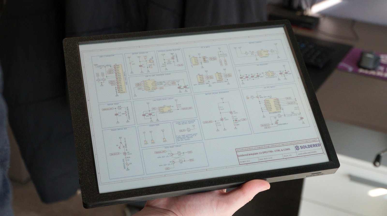 Soldered Electronics ได้พัฒนาจอ e-paper ที่ใช้ชิป ESP32 มาหลายปีแล้วโดยเริ่มตั้งแต่การเปิดตัว Inkplate 6 ในปี 2019, รุ่นล่าสุดคือ Inkplate 13SPECTRA ที่ใช้ชิป ESP32-S3 ที่รองรับ WiFi และ Bluetooth และมาพร้อมจอ E-Ink Spectra สี ขนาด 13.3 นิ้ว ความละเอียด 1600 x 1200 พิกเซล