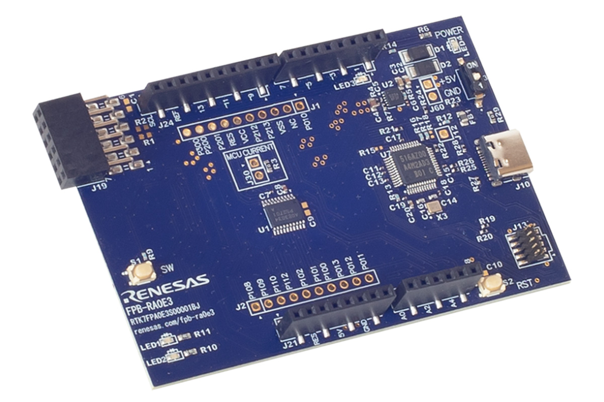 บริษัทยังได้ออกแบบบอร์ดต้นแบบ FPB-RA0E3 (RTK7FPA0E3S00001BJ) สำหรับทดลองใช้งาน (evaluation) และพัฒนาเฟิร์มแวร์ระยะแรก บอร์ดนี้มาพร้อมกับไมโครคอนโทรลเลอร์ Renesas RA0E3 แบบแพ็กเกจ 20 ขา พร้อม Flash 16KB และ SRAM 2KB, วงจร SEGGER J-Link emulator ในตัว, รู Through-hole ที่เข้าถึงขา MCU ได้ครบทุกขา และอินเทอร์เฟซ Arduino Uno และ Pmod เพื่อให้ง่ายต่อการทำต้นแบบ (prototyping) และการขยายระบบเพิ่มเติม