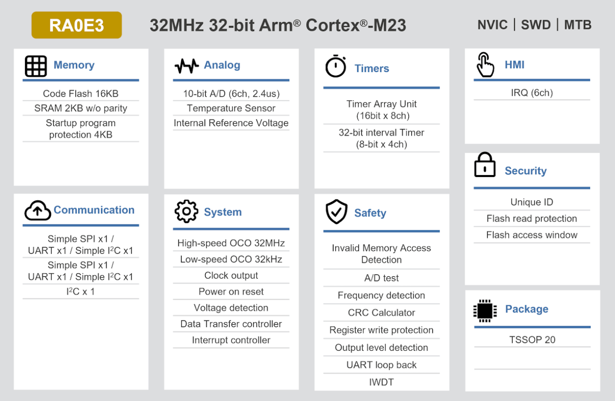 Renesas RA0E3 ยังคงใช้คอร์ Arm Cortex-M23 (สถาปัตยกรรม Armv8-M) ความถี่ 32 MHz พร้อม Flash 16KB และ SRAM 2KB โดยมาพร้อมอุปกรณ์ต่อพ่วงครบครัน ได้แก่ TAU timer แบบ 16-bit จำนวน 8 แชนเนล, interval timer แบบ 32-bit, ADC ความละเอียด 10-bit พร้อมเซนเซอร์วัดอุณหภูมิในตัว, Data Transfer Controller (DTC) และอินเทอร์เฟซสื่อสารแบบ Serial ทั้ง SPI, I²C และ UART (รองรับ LIN) รวมถึงรองรับ GPIO ได้สูงสุด 17 ขา พร้อมฟังก์ชัน Pull-up, Open-drain และแหล่งสัญญาณนาฬิกาภายในตัว ชิปทำงานที่แรงดัน 1.6V ถึง 5.5V รองรับอุณหภูมิ −40°C ถึง +125°C และมาในแพ็กเกจ 20 ขาแบบ TSSOP