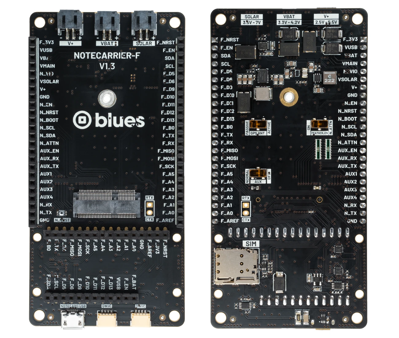 แม้ว่าสุดท้ายแล้วคุณอาจนำ Notecard for Skylo ไปผสานเข้ากับฮาร์ดแวร์ที่ออกแบบเอง แต่สามารถเริ่มต้นใช้งานได้อย่างรวดเร็วด้วยบอร์ด NOTECARRIER ที่รองรับ ซึ่งมีตัวอย่างแสดงไว้ด้านล่าง