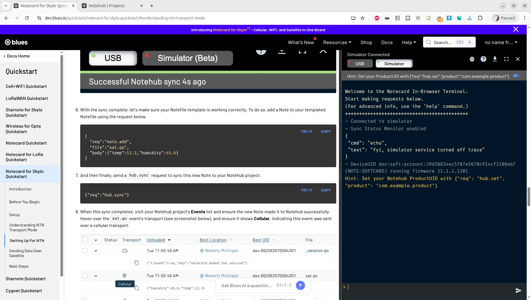 คำแนะนำทั้งหมดสำหรับการเริ่มต้นใช้งาน รวมถึงข้อมูลเพิ่มเติม เช่น พื้นที่ครอบคลุมเครือข่าย (coverage) สามารถดูได้จากเอกสาร datasheet ออนไลน์ แม้ว่าการทดลองใช้งานจริงจะเหมาะกับการมีโมดูลและ carrier board, แต่คุณก็สามารถทดลองประเมินแพลตฟอร์มคลาวด์ได้โดยไม่ต้องมีฮาร์ดแวร์ เพราะมีตัวจำลอง (simulator) ให้ใช้งาน นอกจากนี้ใน datasheet ยังมีเทอร์มินัลที่ใช้งานผ่านเบราว์เซอร์, แต่ Mozilla Firefox ไม่สามารถใช้งานได้ เนื่องจากต้องใช้ WebSerial ดังนั้นควรใช้เบราว์เซอร์อย่าง Google Chrome, Opera, หรือ Microsoft Edge แทน หรือดาวน์โหลดเครื่องมือ Notecard CLI มาใช้งาน