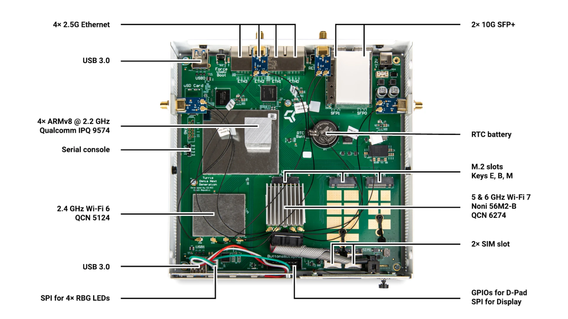 สเปคโดยรวมยังคงเหมือนกับ Turris Omnia NG Wi-Fi 7 router ที่เปิดตัวไปเมื่อเดือนพฤศจิกายนปีที่ผ่านมา โดยยังคงมี SFP+ Ethernet ความเร็ว 10Gbps จำนวน 2 ช่อง และ พอร์ต 2.5GbE RJ45 จำนวน 4 พอร์ต แต่ความสามารถ Wi-Fi 7 (รวมถึงการเชื่อมต่อ 5G เซลลูลาร์) ถูกปรับให้เป็นตัวเลือกเสริมแทน
