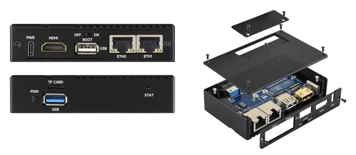 Waveshare “Gigabit / 2.5G Dual Ethernet Mini-Computer (B)” เป็นมินิพีซีแบบบาง ที่ใช้ Raspberry Pi CM5 แบบไม่มีพัดลม รองรับเอาต์พุตวิดีโอ HDMI ความละเอียด 4K พร้อมพอร์ต 2.5GbE และ Gigabit Ethernet แบบ RJ45, พอร์ต USB สองช่อง, ช่อง microSD และพอร์ต USB-C สำหรับจ่ายไฟ