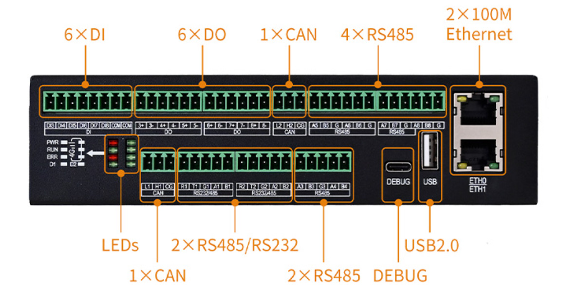 • รุ่น Extended: 8x RS485, 2x RS232, 2x CAN FD / CAN 2.0B