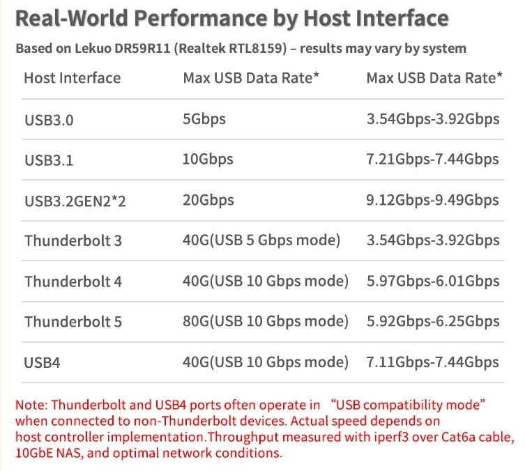 ถ้าต้องการใช้ประสิทธิภาพของอะแดปเตอร์ที่ใช้ชิป Realtek RTL8159 ออกมาได้เต็มที่ คุณจะต้องใช้ระบบที่มีพอร์ต USB 3.2 Gen 2×2 ความเร็ว 20 Gbps ซึ่งหาได้ค่อนข้างยาก เนื่องจากคอมพิวเตอร์และแล็ปท็อปที่รองรับพอร์ต 20 Gbps ยังมีไม่มากนัก และเราเองก็ไม่เคยรีวิวเครื่องที่มีพอร์ตลักษณะนี้มาก่อน ที่สำคัญคือพอร์ต Thunderbolt 40 Gbps และ USB4 ที่หลายคนคาดว่าจะทำงานได้ดี กลับทำงานในโหมด compatibility (โหมดเข้ากันได้) ทำให้ประสิทธิภาพลดลง โดยผลการทดสอบของบริษัทพบว่าพอร์ต USB4: ประมาณ 7.11 – 7.44 Gbps, พอร์ต Thunderbolt 4: ประมาณ 5.97 – 6.01 Gbps และพอร์ต Thunderbolt 3: ประมาณ 3.54 – 3.92 Gbps ซึ่งความเร็วบน Thunderbolt 3 นั้นแทบไม่ต่างจากพอร์ต USB 3.0 ความเร็ว 5 Gbps เลย
