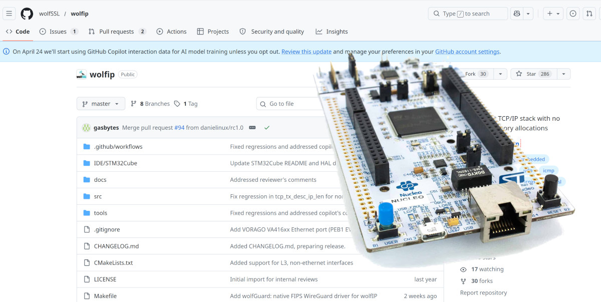 wolfSSL SSL/TLS เป็นที่รู้จักกันดีจากไลบรารีแบบโอเพ่นซอร์ส และบริษัท wolfSSL ได้เปิดตัว wolfIP ซึ่งเป็นสแตก TCP/IP แบบโอเพ่นซอร์สที่มีน้ำหนักเบา (lightweight) โดยออกแบบมาให้ไม่มีการจัดสรรหน่วยความจำแบบไดนามิก (เช่น ไม่มีการเรียกใช้ malloc) เหมาะสำหรับระบบฝังตัว (embedded systems) ที่มีทรัพยากรจำกัด