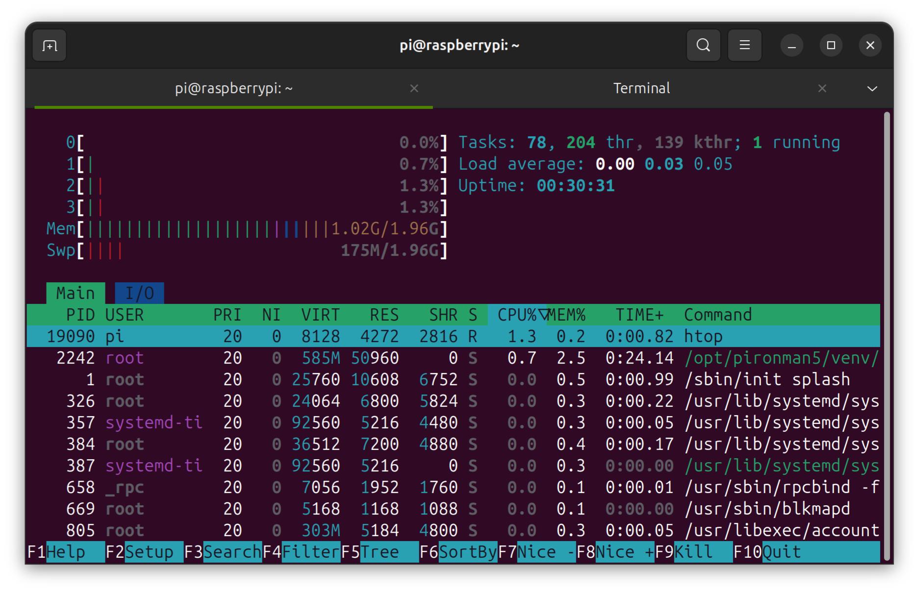 pi@raspberrypi:~ $ zramctl NAME ALGORITHM DISKSIZE DATA COMPR TOTAL STREAMS MOUNTPOINT /dev/zram0 zstd 2G 181.9M 22.7M 29.6M 4 [SWAP] pi@raspberrypi:~ $ free -mh total used free shared buff/cache available Mem: 2.0Gi 1.2Gi 213Mi 38Mi 794Mi 808Mi Swap: 2.0Gi 178Mi 1.8Gi |