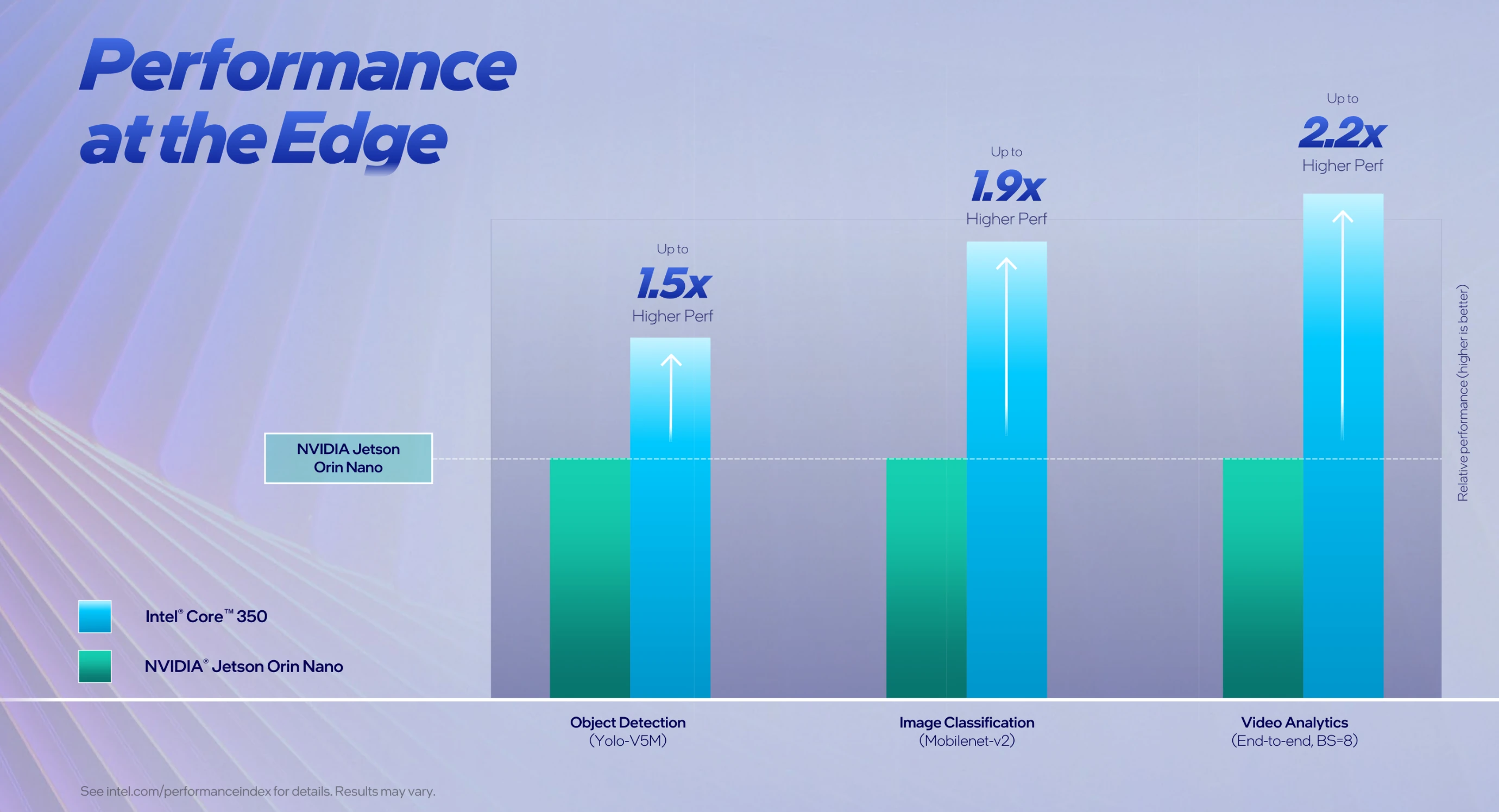 Intel Core Series 3 ยังมุ่งเป้าไปที่การใช้งานด้าน Edge เช่น หุ่นยนต์ ระบบอาคารอัจฉริยะ (Smart Building), เครื่องขายหน้าร้าน (POS) และระบบมิเตอร์อัจฉริยะ โดยในส่วนนี้ได้มีการเปรียบเทียบ Intel Core 7 350 กับ Jetson Orin Nano ซึ่งพบว่า SoC ของ Intel ให้ประสิทธิภาพการตรวจจับวัตถุ (object detection) สูงขึ้นสูงสุด 1.5 เท่า, การจำแนกภาพ (image classification) เร็วขึ้นสูงสุด 1.9 เท่า และประสิทธิภาพด้านวิเคราะห์วิดีโอ (video analytics) สูงขึ้นสูงสุด 2.2 เท่า