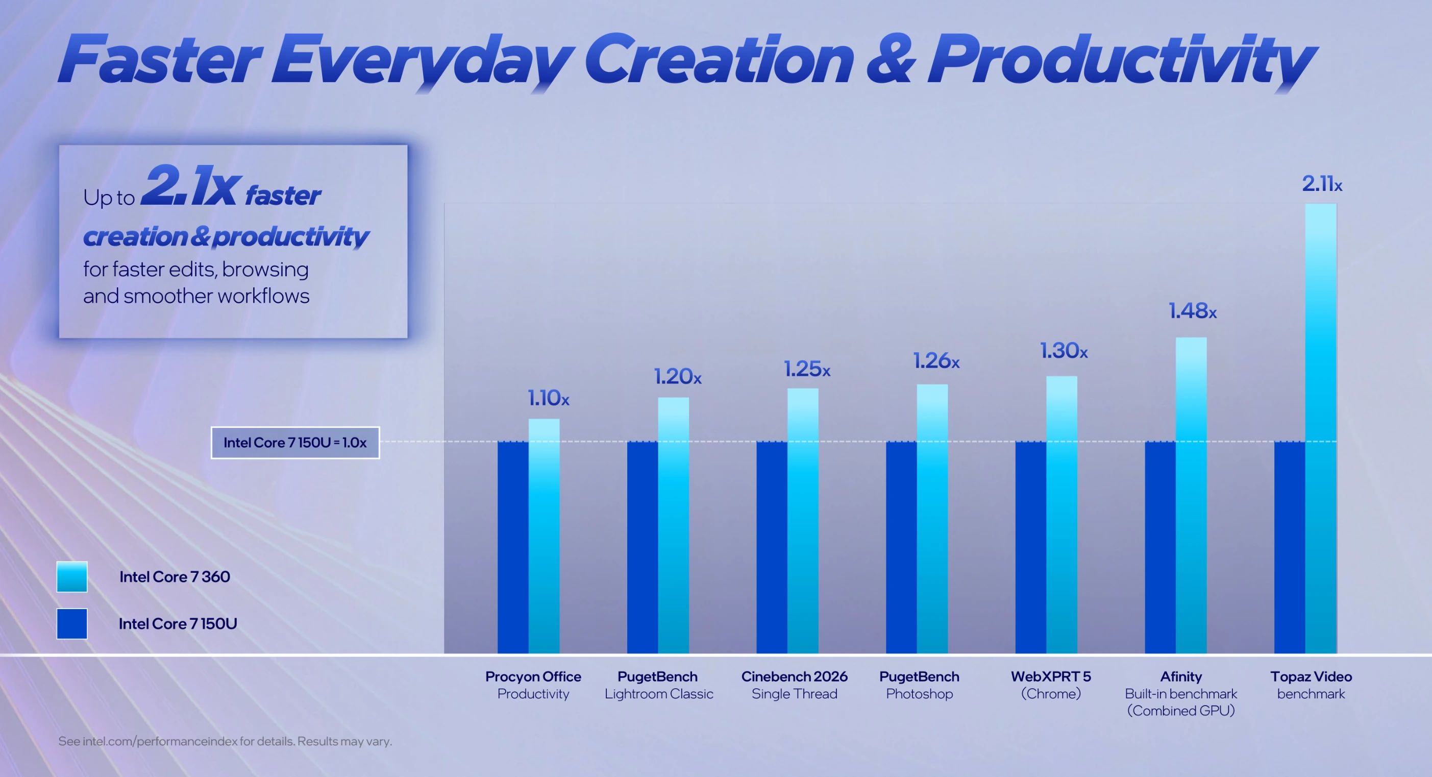 ก่อนหน้านี้มีการคาดการณ์ว่าตระกูล Wildcat Lake จะเป็นรุ่นสืบทอดของ Alder Lake-N และ Twin Lake แต่ทาง Intel กลับนำ Intel Core 7 360 ไปเปรียบเทียบกับ Intel Core 7 150U ซึ่งเป็นโปรเซสเซอร์สถาปัตยกรรม Raptor Lake แบบ 10 คอร์ (2P + 8E) แทน โปรเซสเซอร์ Wildcat Lake รุ่นใหม่นี้สามารถให้ประสิทธิภาพด้านการสร้างสรรค์งานและการทำงานทั่วไปได้เร็วขึ้นสูงสุดถึง 2.1 เท่า เมื่อทดสอบด้วย Topaz Video benchmark
