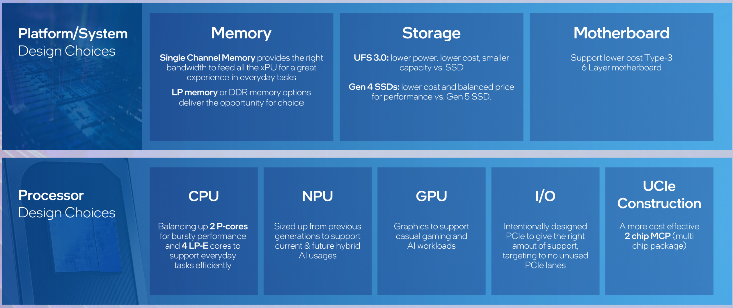 ข้อมูลที่หลุดออกมาก่อนหน้านี้เกี่ยวกับ SKU ส่วนใหญ่ถือว่าถูกต้อง แต่ทาง Intel ได้ระบุ SKU สำหรับทั้งกลุ่มพีซีและงาน Edge ซึ่งหลายรุ่นมีความซ้ำซ้อนกัน ทุกรุ่นมีค่า PBP (Processor Base Power) ที่ 15W และค่า MTP (Maximum Turbo Power) ที่ 35W มาพร้อมแคช Intel Smart Cache ขนาด 6MB และรองรับหน่วยความจำสูงสุด 48GB แบบ LPDDR5x-7467 หรือ 64GB แบบ DDR5-6400 อย่างไรก็ตาม มีอยู่หนึ่งรุ่นคือ Intel Core 5 305 ที่ไม่มี NPU (หน่วยประมวลผล AI) มาให้เลย และถูกกำหนดไว้สำหรับการใช้งานด้าน Edge โดยเฉพาะ