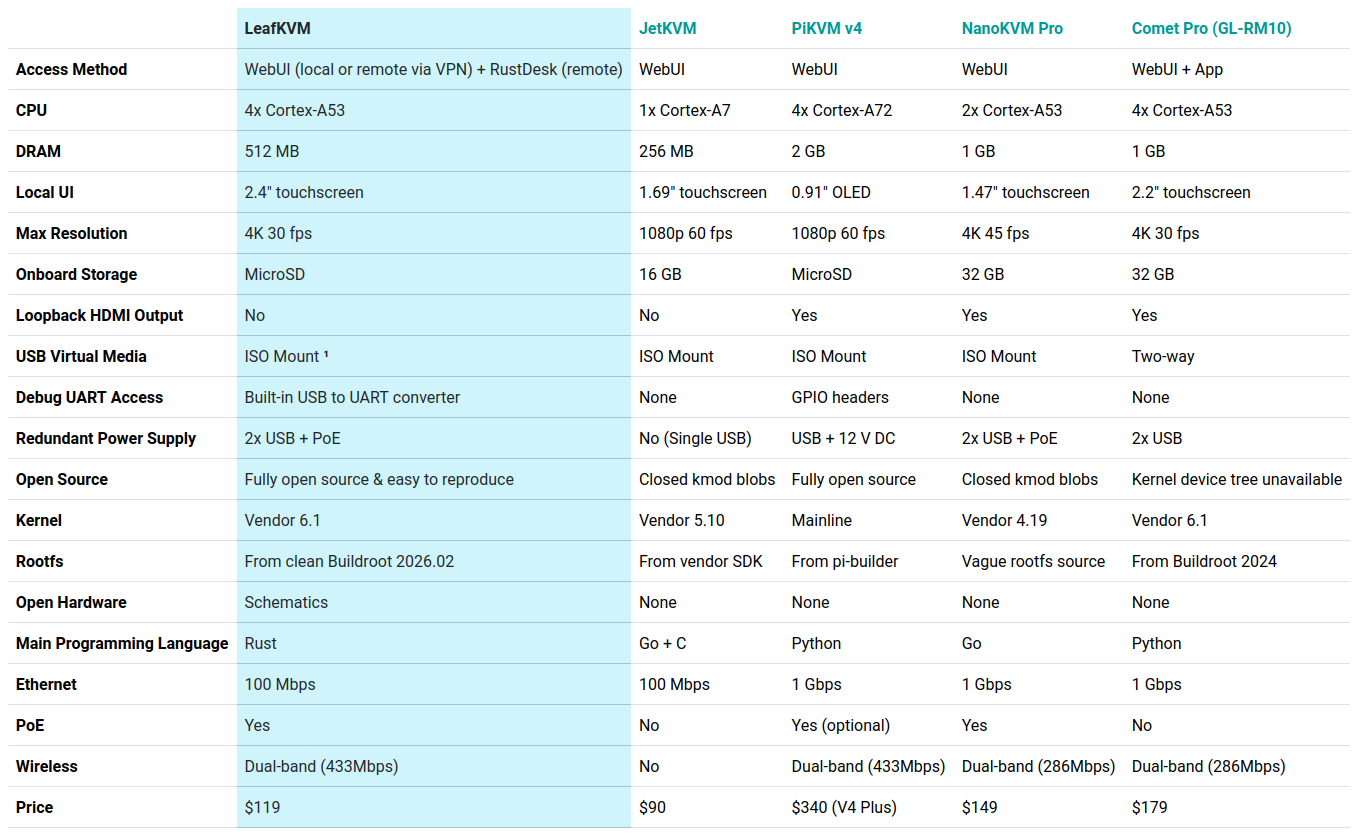 LeafKVM vs JetKVM vs PiKVM v4 vs NanoKVM Pro vs Comet Pro
